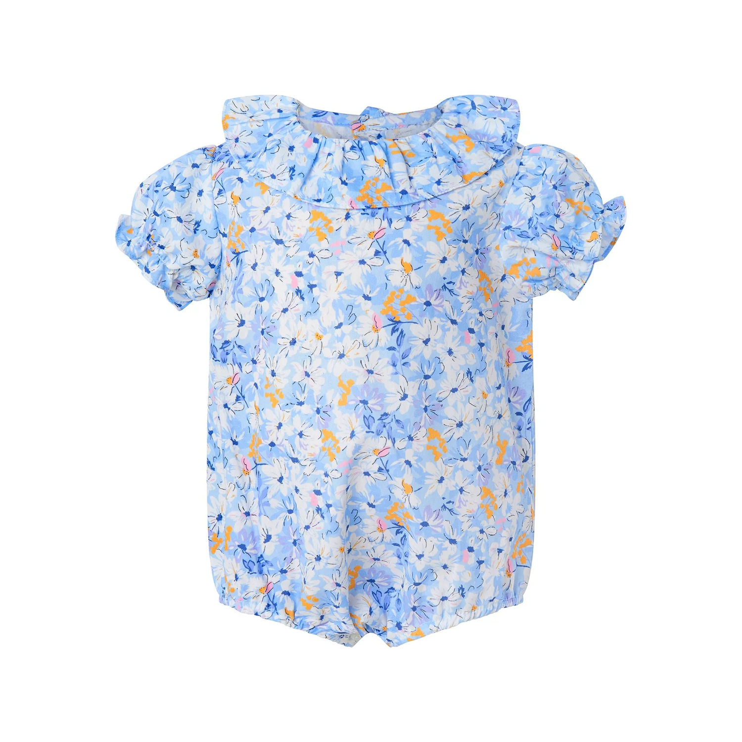 This beautiful cotton romper is perfect for baby girls. With a sweet blue floral print and coordinating frill collar, it's both stylish and comfortable. Features include short puff sleeves, a button closure at the back and inner leg for easy changing. Keep your little one looking cute and feeling cozy all day.