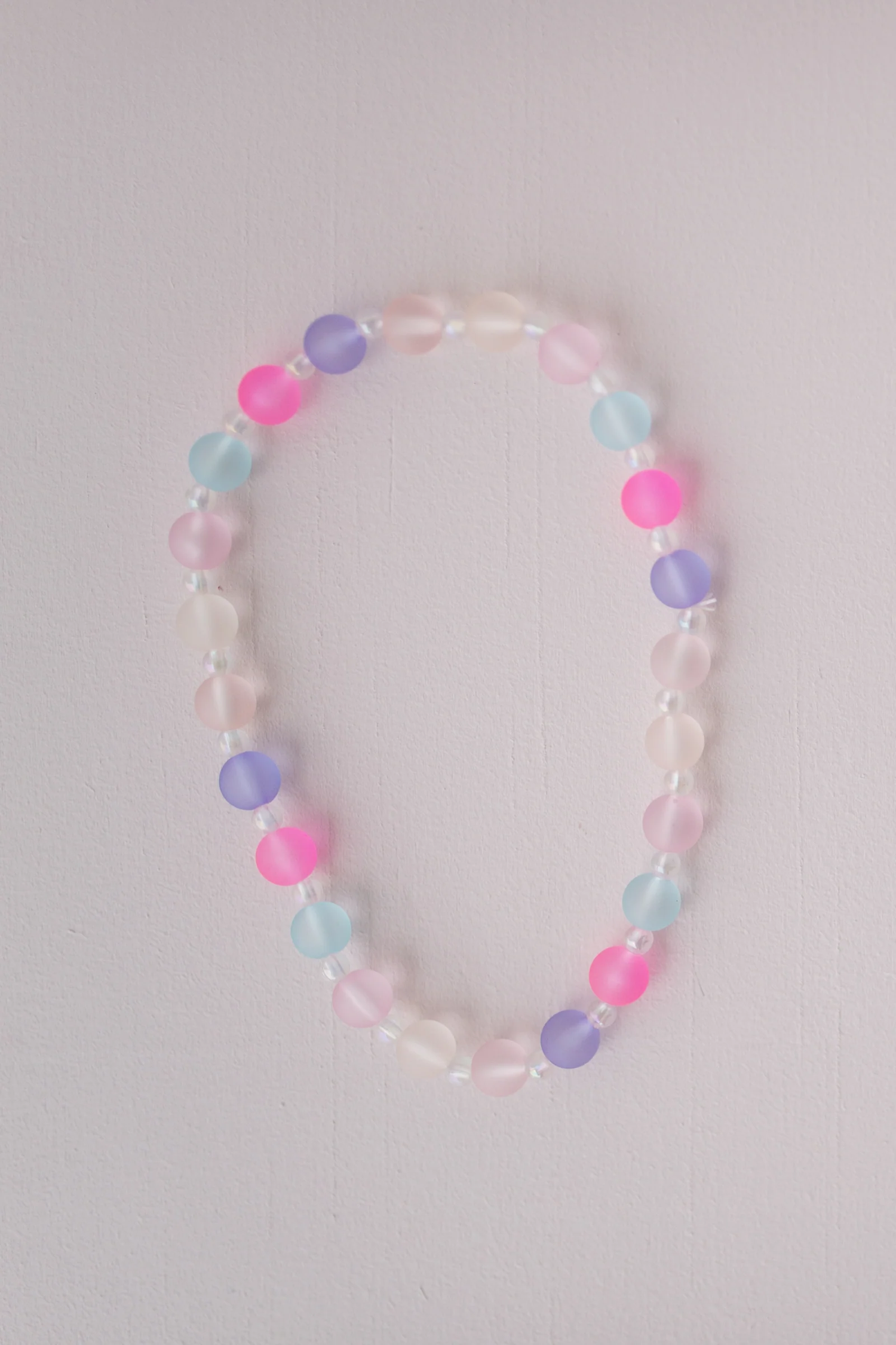 This bumpy bead bracelet is made with blue, pink, and purple frosted beads, alternating between smaller clear beads. Be sure to check out its matching bracelet!