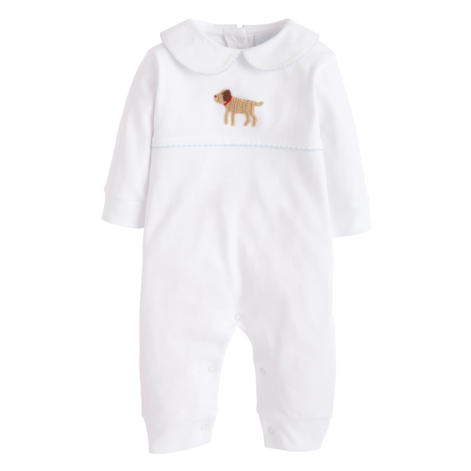 Woof woof! Our Boy Lab Crochet Playsuit is an adorable, signature style for baby boys with a classic lab design that's crocheted by hand and complete with a light blue collar. This playsuit is made from soft, 100% Peruvian Pima cotton and features light blue picot trim along the collar and across the chest. Add the matching Crochet Cardigan to indulge your little one or give the gift of timeless style with this signature look!