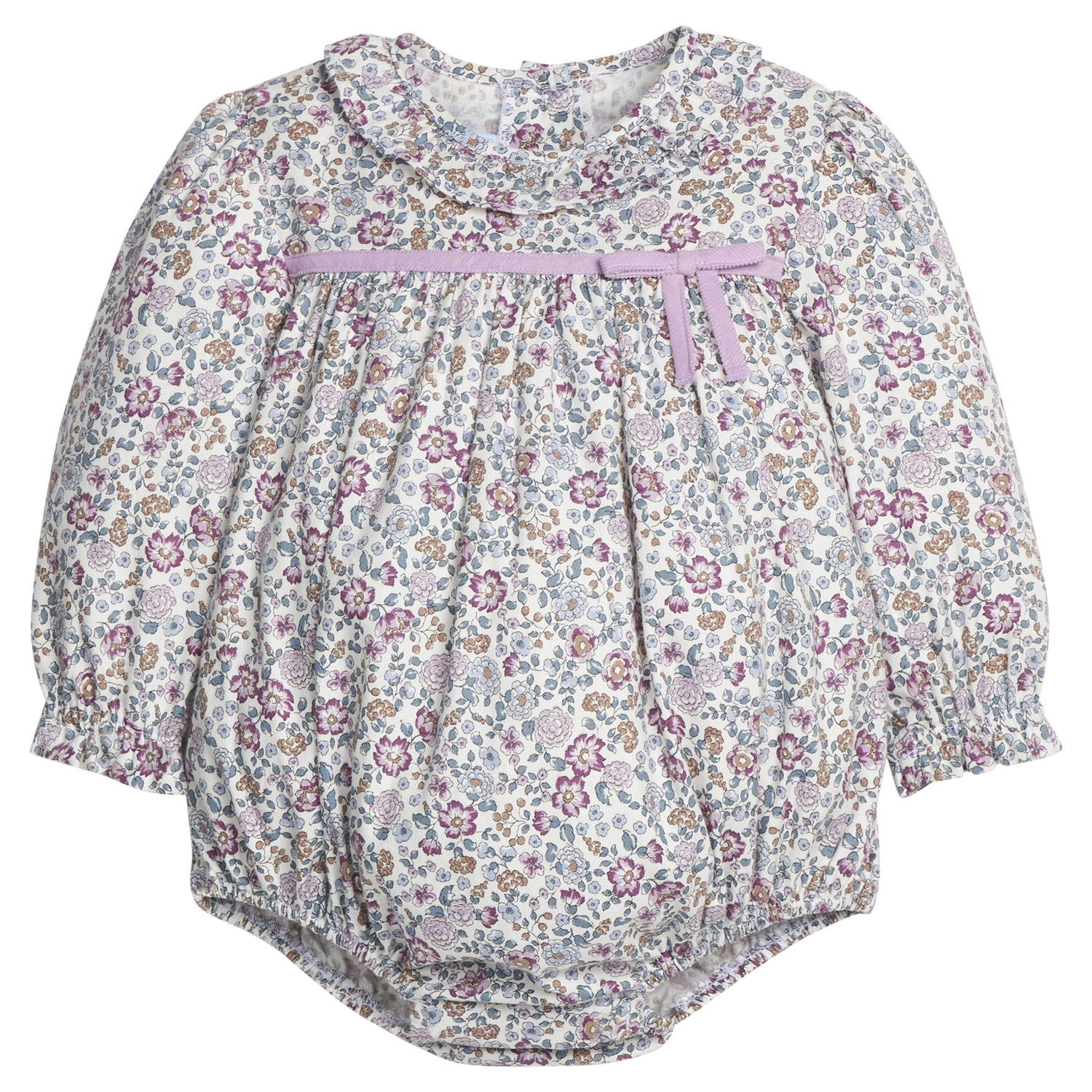 Meet the Emma Bubble! This classic, long sleeve silhouette features a delicate ruffled collar and high chest band trimmed in lavender corduroy. With muted, autumnal hues, the Margaux Floral is lovely for family photos, Thanksgiving celebrations, and everything in between! Big sister can perfectly match in our new Emma Dress.