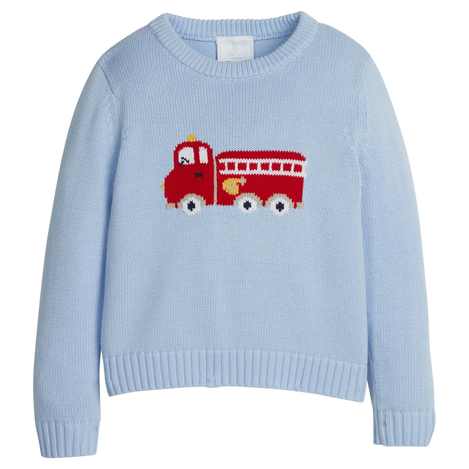 Every little boy needs a Fire Truck Intarsia Sweater! This signature LE style features a beautiful light blue base and adorable red fire truck in the center. Layer over our Printed Turtleneck - fire Trucks and pair with our Banded Pant in Navy Corduroy bottoms for a look your little boy will love!