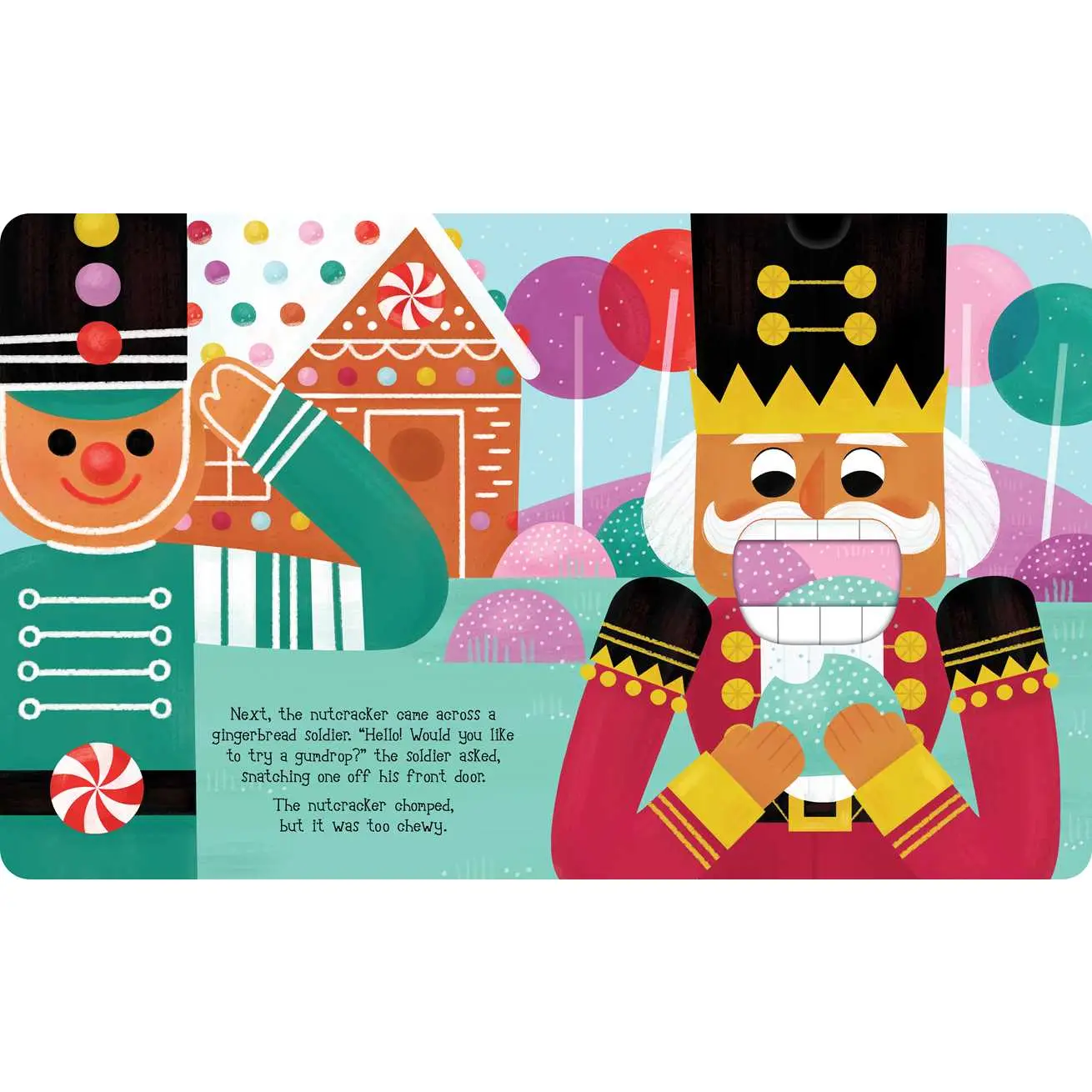 pulling the tabs to help the nutcracker find the perfect snack on Christmas Eve! It's Christmas Eve, and the nutcracker is hungry! He jumps into little Clara's dreams to find the perfect snack before everyone wakes up on Christmas morning. Kids will love making the nutcracker take big bites of classic snacks from in this interactive, yummy adventure.