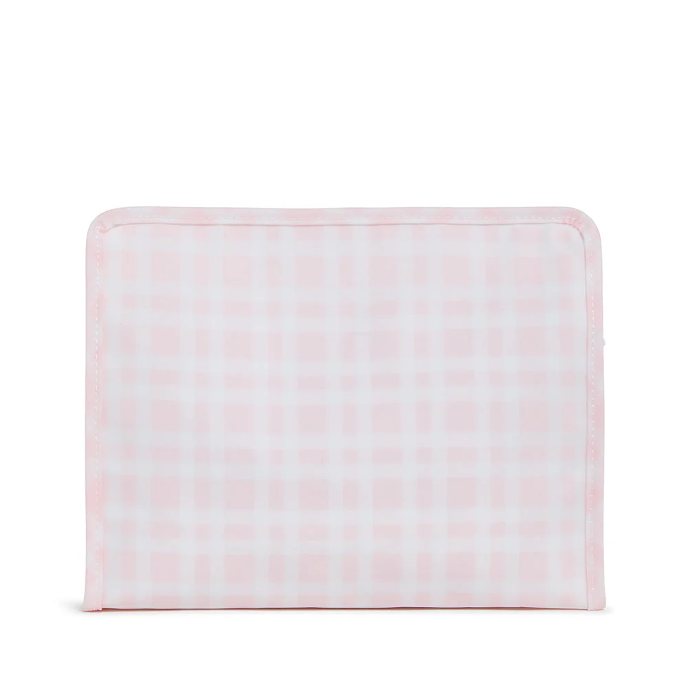 Our best-selling Roadies are our BFFs in the pouch world! Available in 3 sizes, our Medium Roadie is made in a cotton gingham with a thin Eco-friendly matte coating, an inside slip pocket and exterior snap open zip tabs for a wider opening and an easier access.